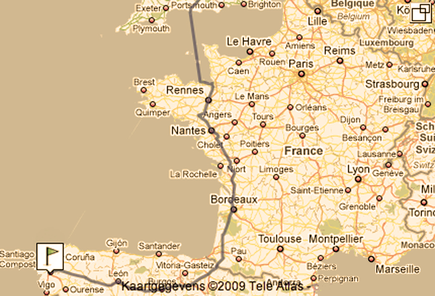 En nu het Jacobspad: de Camino. Onze route loopt van Stonehenge naar Weymouth in Zuid Engeland waar we de boot nemen naar Saint Malo in Frankrijk en verder via Mont Saint Michel naar de Pyreneeën. Dan zijn we op de helft.Daarna de Pyreneeën over en via de Camino Frances naar Santiago de Compostela. We overnachten in pensions. |